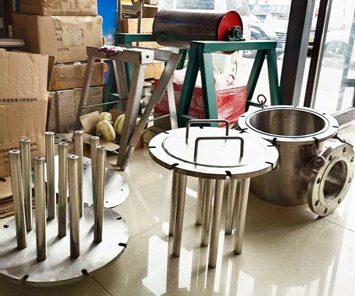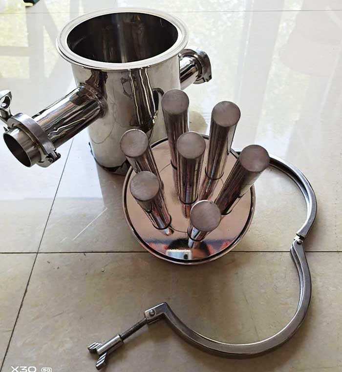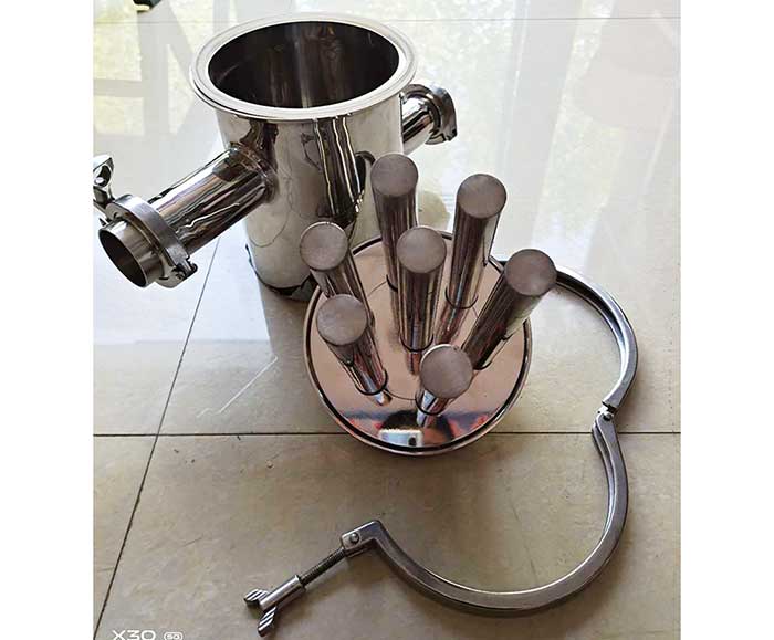 流體式除鐵器外殼材質不銹鋼,內部磁芯采用稀土永磁鐵。通常磁芯固定在蓋板上,清理磁芯表面的鐵磁性雜質時,打開蓋板固定螺栓,提起蓋板,清理磁棒表面的鐵雜質即可,在實際操作時比較方便。
